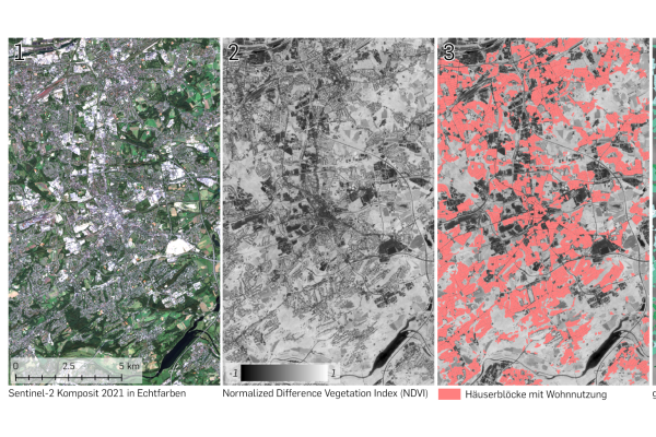 Je nach Fragestellung und Maßstabsebene kommen verschiedenste Erdbeobachtungsdaten wie Luft- oder Satellitenbilder zum Einsatz. Diese Daten werden von öffentlichen Dienststellen (z.B. Geobasis.NRW) bereitgestellt oder von Betreibern der Erdbeobachtungssatelliten (z.B. Copernicus) im Falle von Open Data Produkten heruntergeladen oder bei kommerziellen Anbietern gekauft. Ergänzend ist die Arbeitsgruppe Geo-Fernerkundung in der Lage hochaufgelöstes Bildmaterial sehr flexibel mit einer professionellen Drohne aufzunehmen.