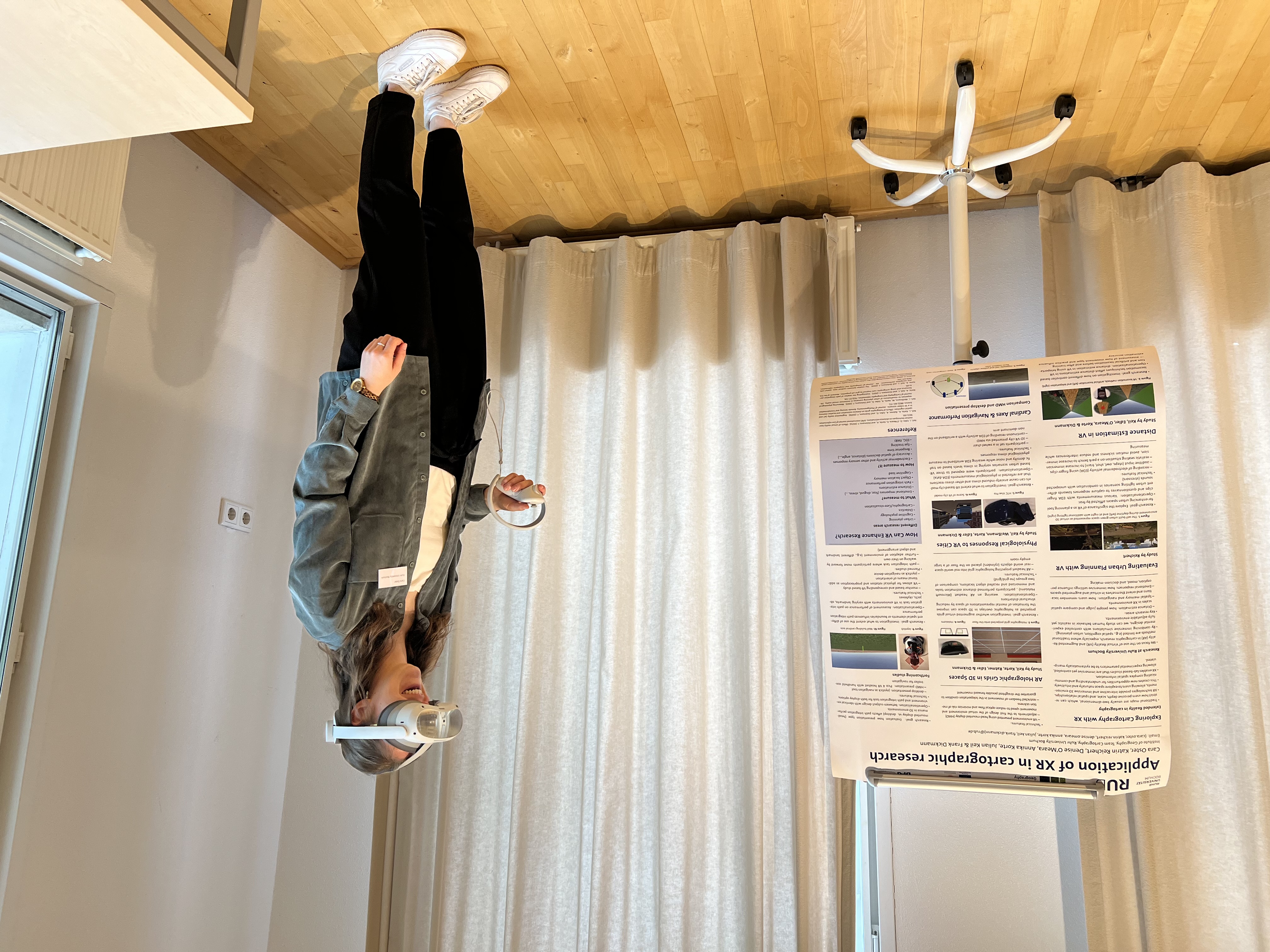 Unsere drei Doktorandinnen präsentierten ein Poster zur Anwendung von XR in kartographischen Studien und zeigten Demos ihrer Experimente, bei denen Teilnehmende sowohl eine VR- als auch eine monitorbasierte Navigationsaufgabe ausprobieren konnten.