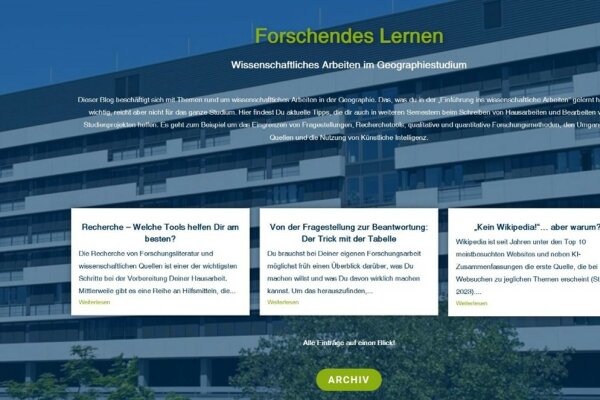Du brauchst Hilfe beim Strukturieren deiner Hausarbeit oder bist nicht zufrieden mit deinen Rechercheergebnissen? Die „Einführung ins wissenschaftliche Arbeiten“ bietet zwar einen guten Einstieg für Studierende der Geographie, sie allein bringt euch jedoch nicht durch das gesamte Studium. Unser neuer Blog Forschendes Lernen knüpft daran an, indem Themen rund ums wissenschaftliche Arbeiten vertieft werden und Studierende auch in fortgeschrittenen Semestern Tipps und Tricks zum Schreiben von Hausarbeiten und zur Bearbeitung von Studienprojekten erhalten. In den bisher veröffentlichen Beiträge geht es z. B. um KI-basierter Literaturrecherche, die systematische Beantwortung von Forschungsfragen oder die Risiken bei der Nutzung wissenschaftlich ungeeigneter Quellen wie KI-Zusammenfassungen und Wikipedia. Ihr findet den Blog hier.