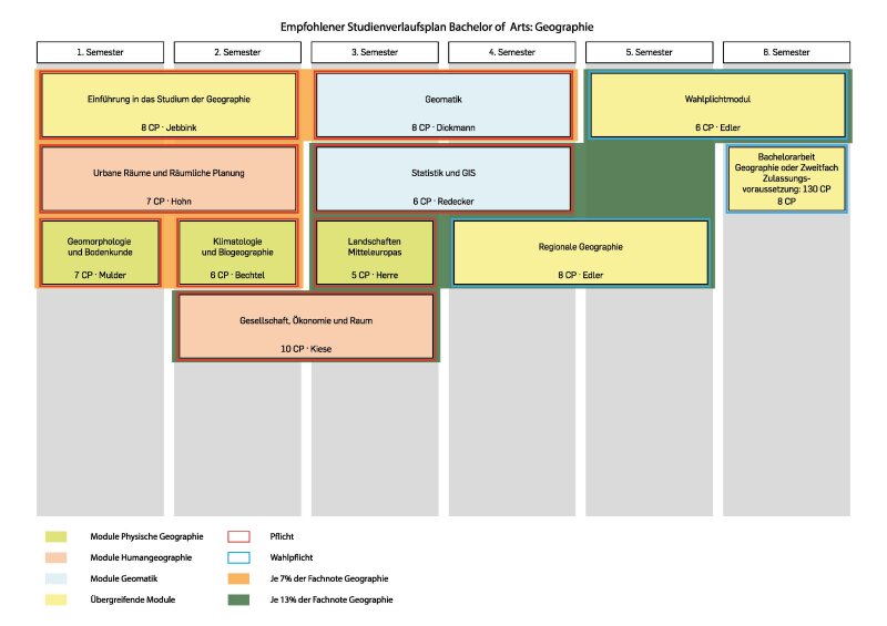 Der erfolgreiche Abschluss des B.A.-Studiums ist die Grundlage für den aufbauenden didaktischen Studiengang Master of Education (M.Ed.), auf den das Referendariat an Gymnasien oder Gesamtschulen folgt. Nach dem B.A.-Studiengang kann in Geographie ebenfalls ein M.Sc.-Studium angeschlossen werden.